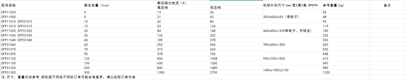 | 型號 | 額定容量 (KVA) | 額定輸出電源(A) | 機柜外形尺寸 | 備注 | |