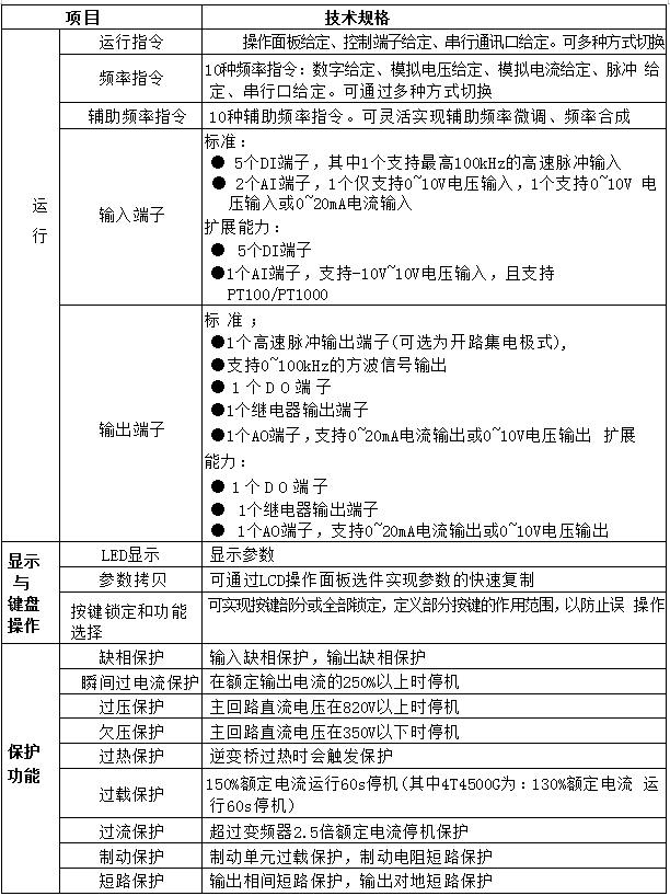 本系列變頻器是一款通用高性能電流矢量變頻器主要用于控制和調節??三相交流異步電機的速度和轉矩。采用高性能的矢量控制技術低速高轉矩??輸出,具有良好的動態特性、超強的過載能力,性能穩定,保護功能強大,?人機界面簡潔、操作簡易。其廣泛應用于工業領域、制造業、軌道交通、能源與動力行業、造紙、拉絲、機床、包裝、食品、?風機、水泵及各種自動化生產設備的驅動。